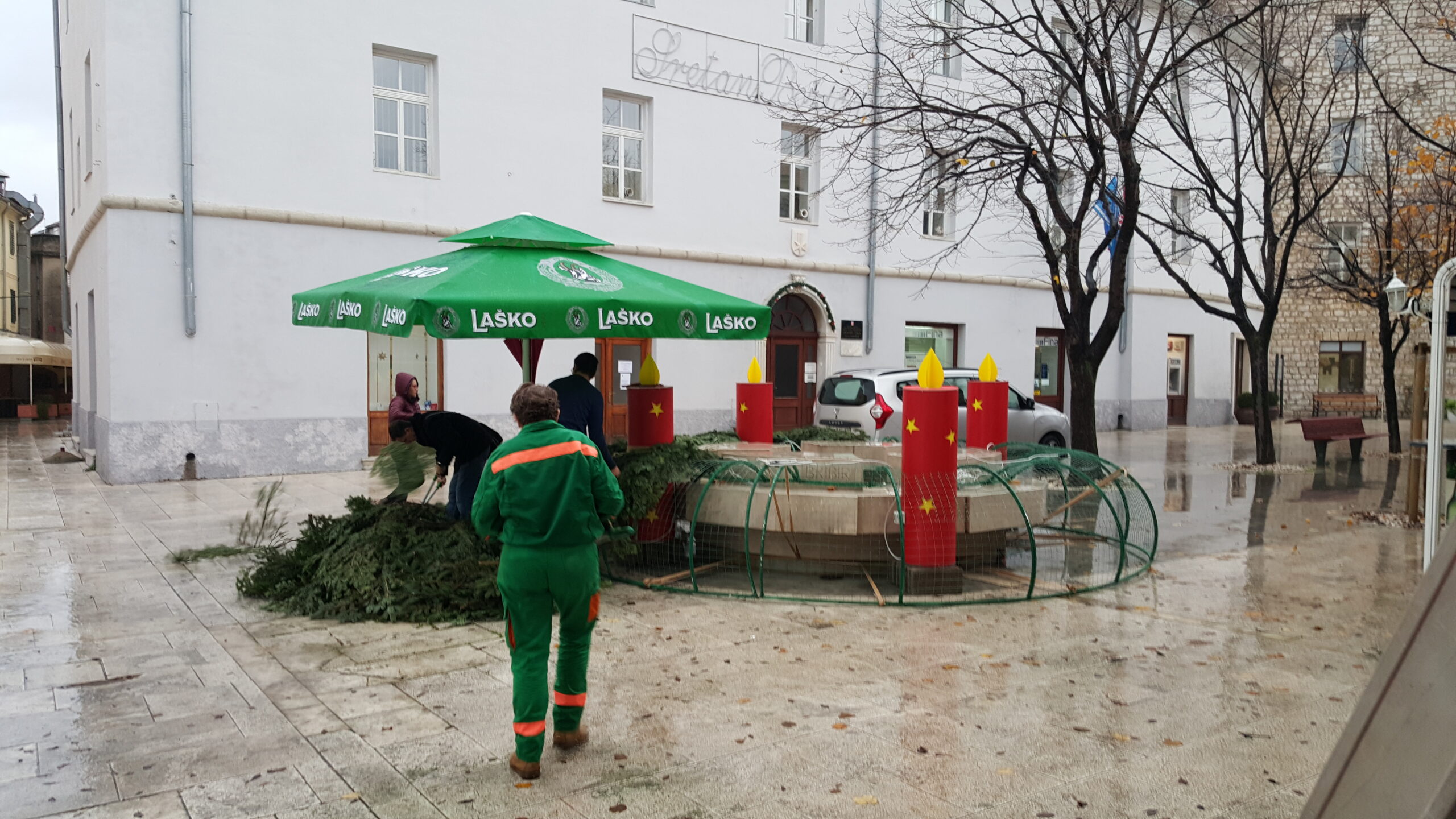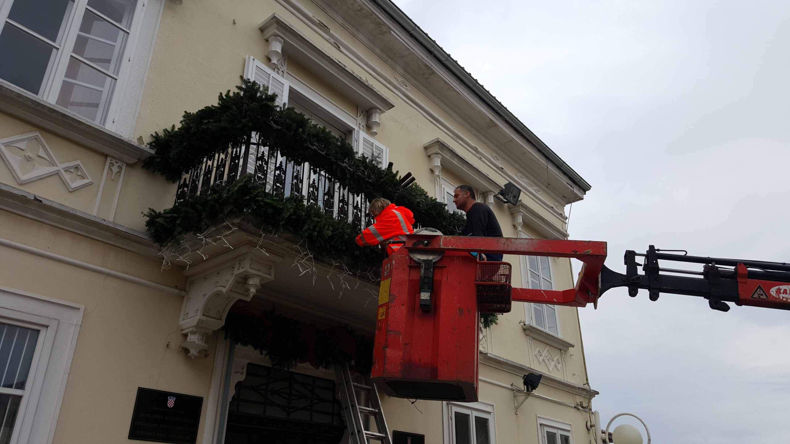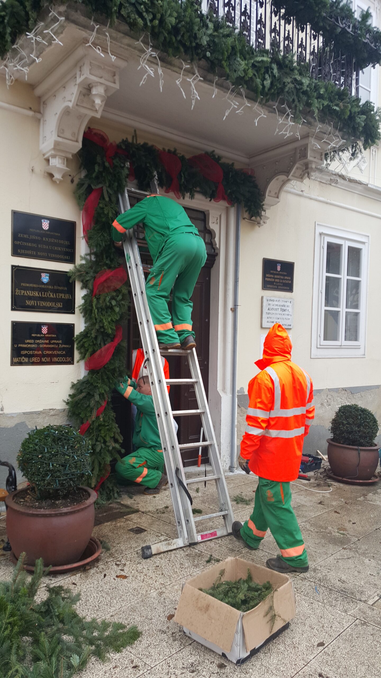 Ukrašene su i obližnje fasade i balkon upravne zgrade komunalnog društva. Šišane forme šimšira u velikim teglama, također su dobile adventski ukras.