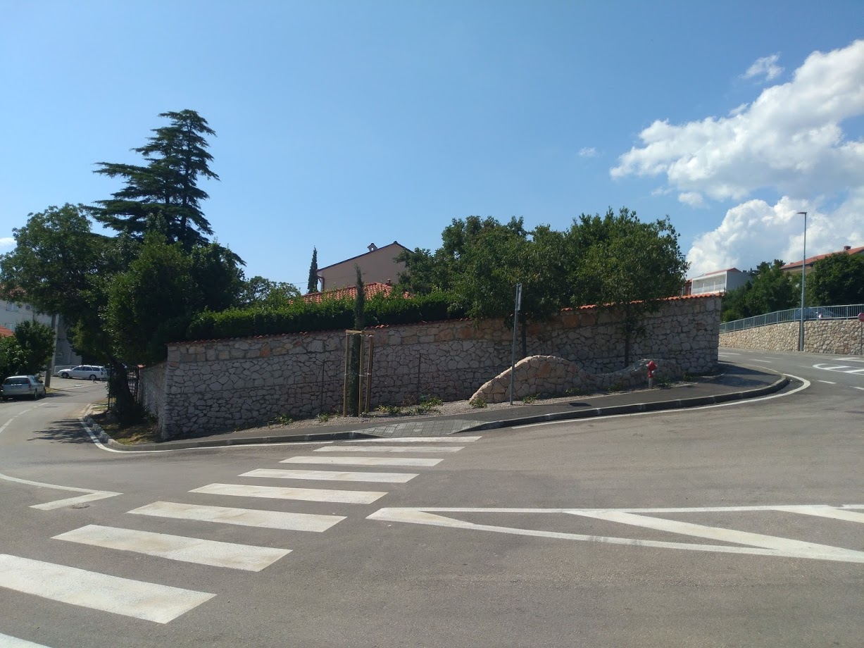 Zadržavanjem postojeće autohtone vegetacije te izborom novih vegetacijskih elemenata očuvala se veza sa izvornošću prostora ali i postigla vizualna eksponiranost, identitet i kvaliteta prostora. Prostorom dominiraju postojeća i dvije novoposađene stare masline (debla promjera cca 50 cm i 20 cm). Formom i bojom maslinama kontriraju visoki uski čempresi (Cupressus sempervirens ‘Piramisalis). Novoizvedenom travnatom plohom površine 125 m2 dominiraju zidani kameni valovi i suhozid – gromača te dva nosača za penjačice – u obliku luka i u obliku vertikalnog nosača. Pažnju na nosačima plijeniti će sljedeće penjačice: Pharthenocissus tricuspidata ‘Veichi’, Parthenocissus quinquefolia, Clematis ‘Docteur Ruppel’, Wisteria floribunda ‘Bleck Dragon’, Solanum jasminoides, Passiflora coerulea i Campsis spp. Ostale posađene biljne vrste su: Pittospoprum tobira ‘Nana’, Rhynchospremum jasminoides, Rosmarinus officinalis ‘Prostratus’ i Genista lydia. Na cijeloj uređenoj površini postavljen je sustav za automatsko navodnjavanje. Osim kamenih valova i suhozida građevinskim radovima izveden je potporni zid te postavljeni parkovni rubnjaci uz pješačku stazu.