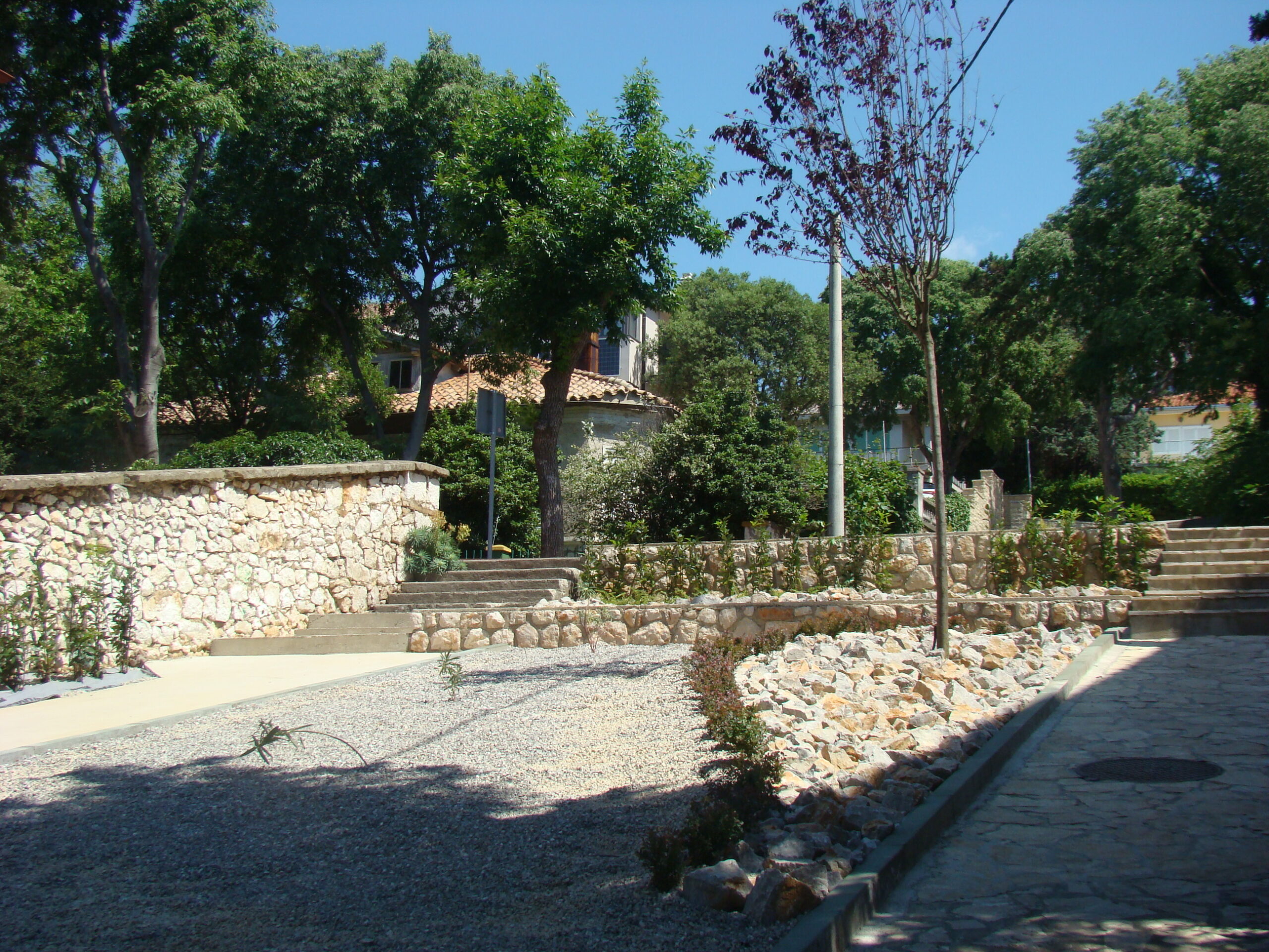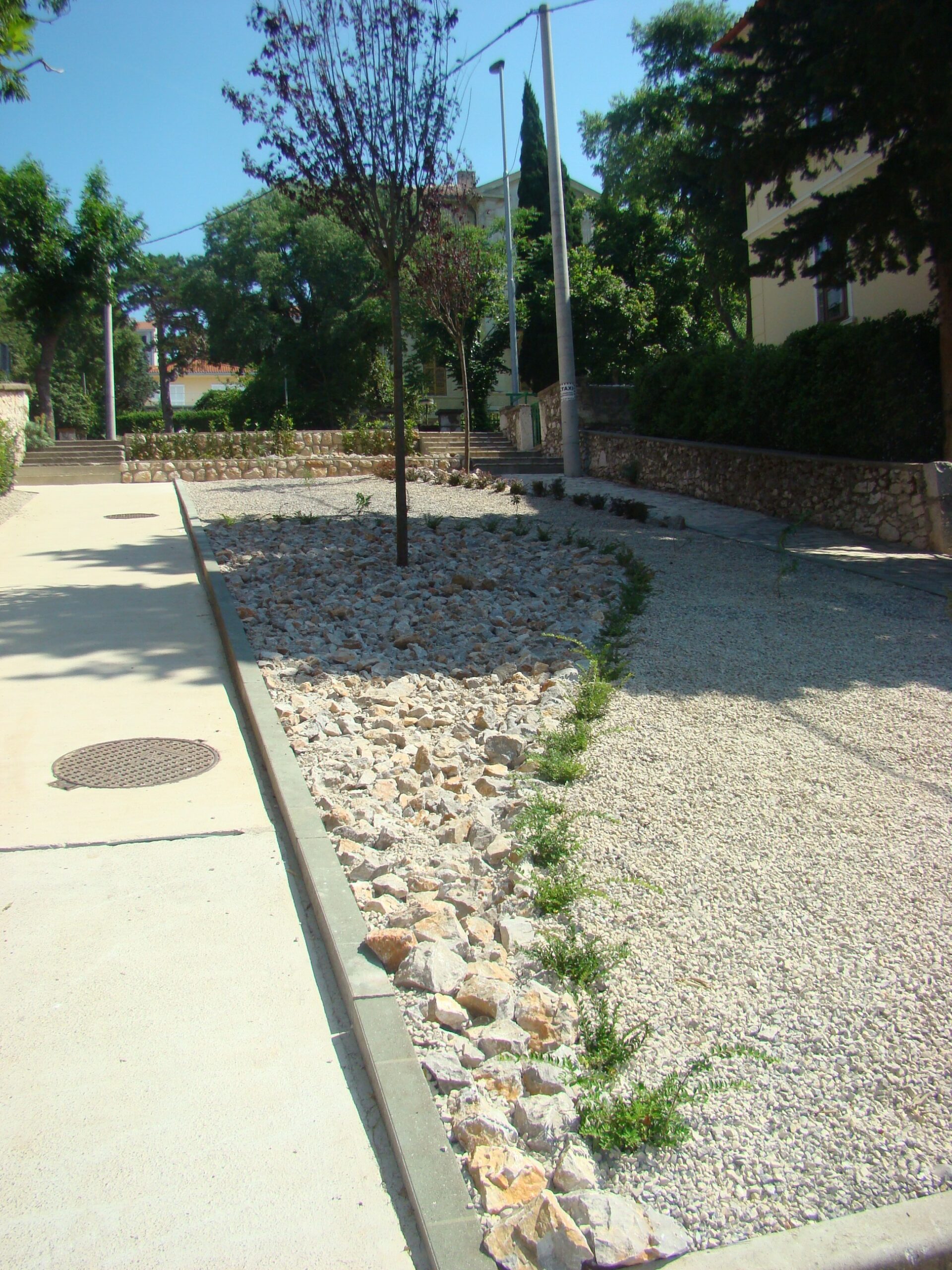 Rubno su posađene živice od lovora kao miran zeleni okvir. Gornjom etažom dominira crvenolisna šljiva – Prunus cerasifera „Pisardii“, koja će u proljeće biti prekrivena mnoštvom sitnih rozih cvijetića, a u jesen plodovima. Središnji prostor prekriven je kamenom u tri veličine.