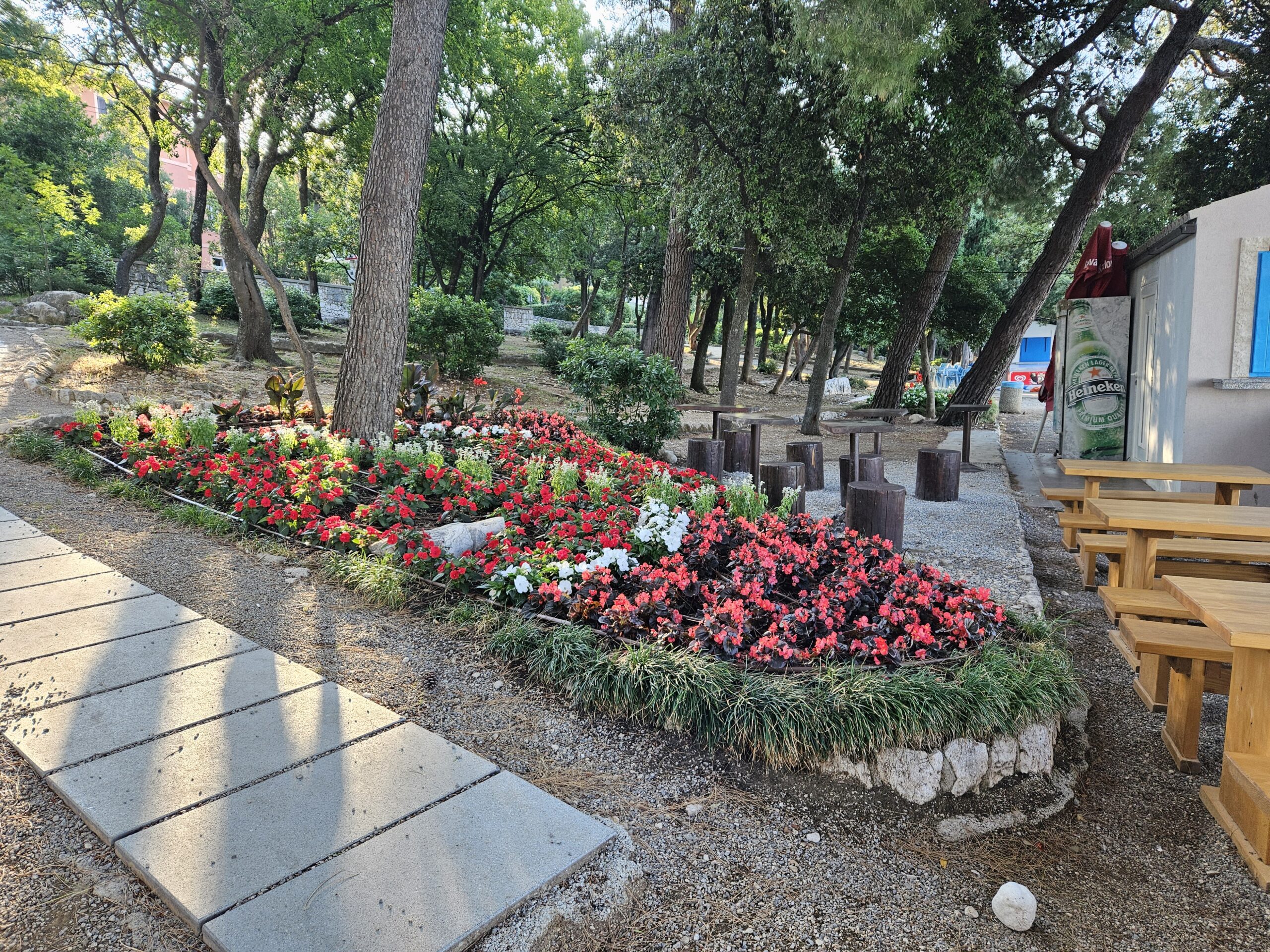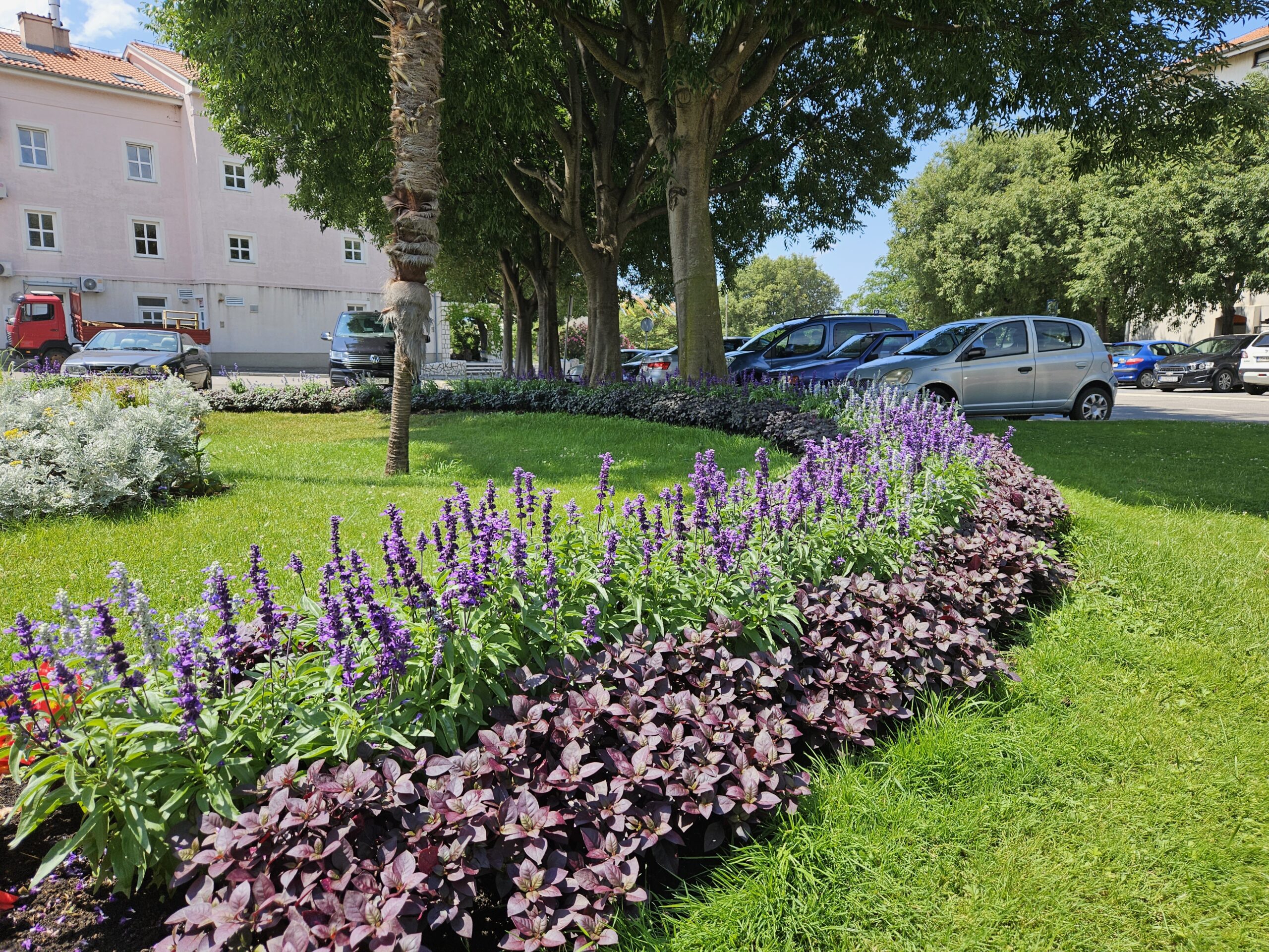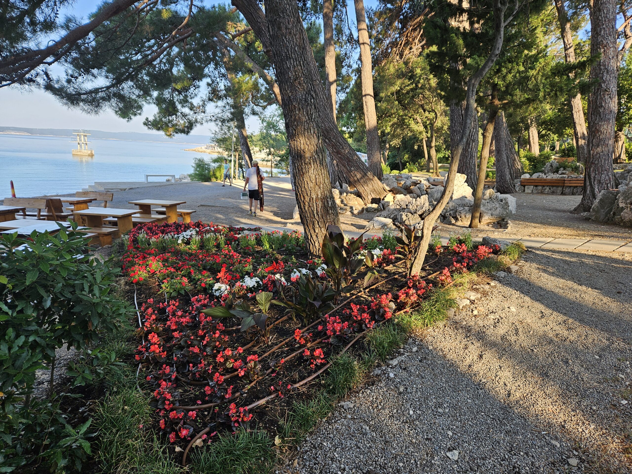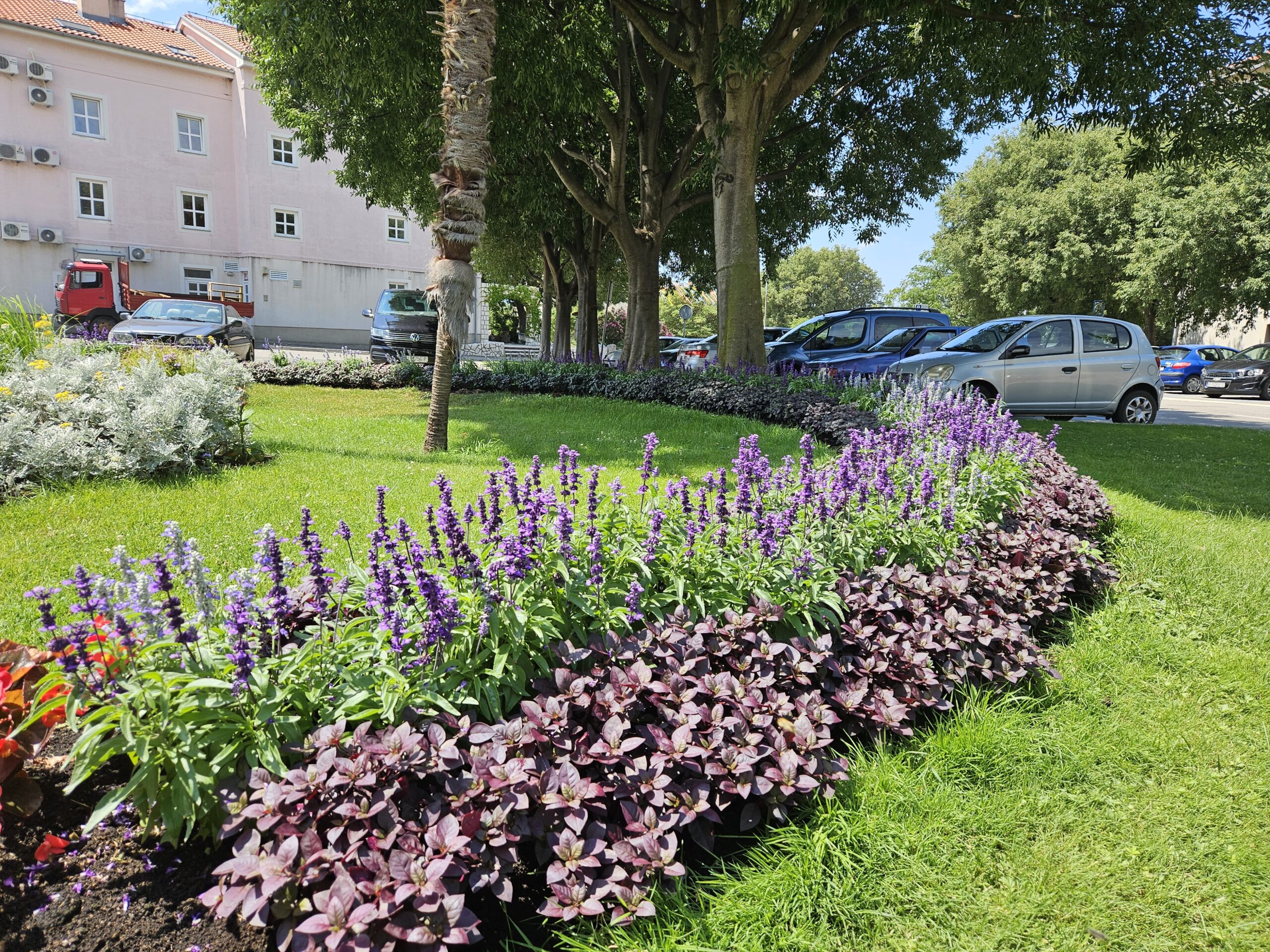 Cvjetne  gredice u ljeto 2023. obojane su raznim bojama; crveno, rozo, plavo. Crvene kane podižu pogled od horizontalih cvijetnih oblika, prema rascvjetnim oleanderima, indijskim jorgovanima i visokim palmama.