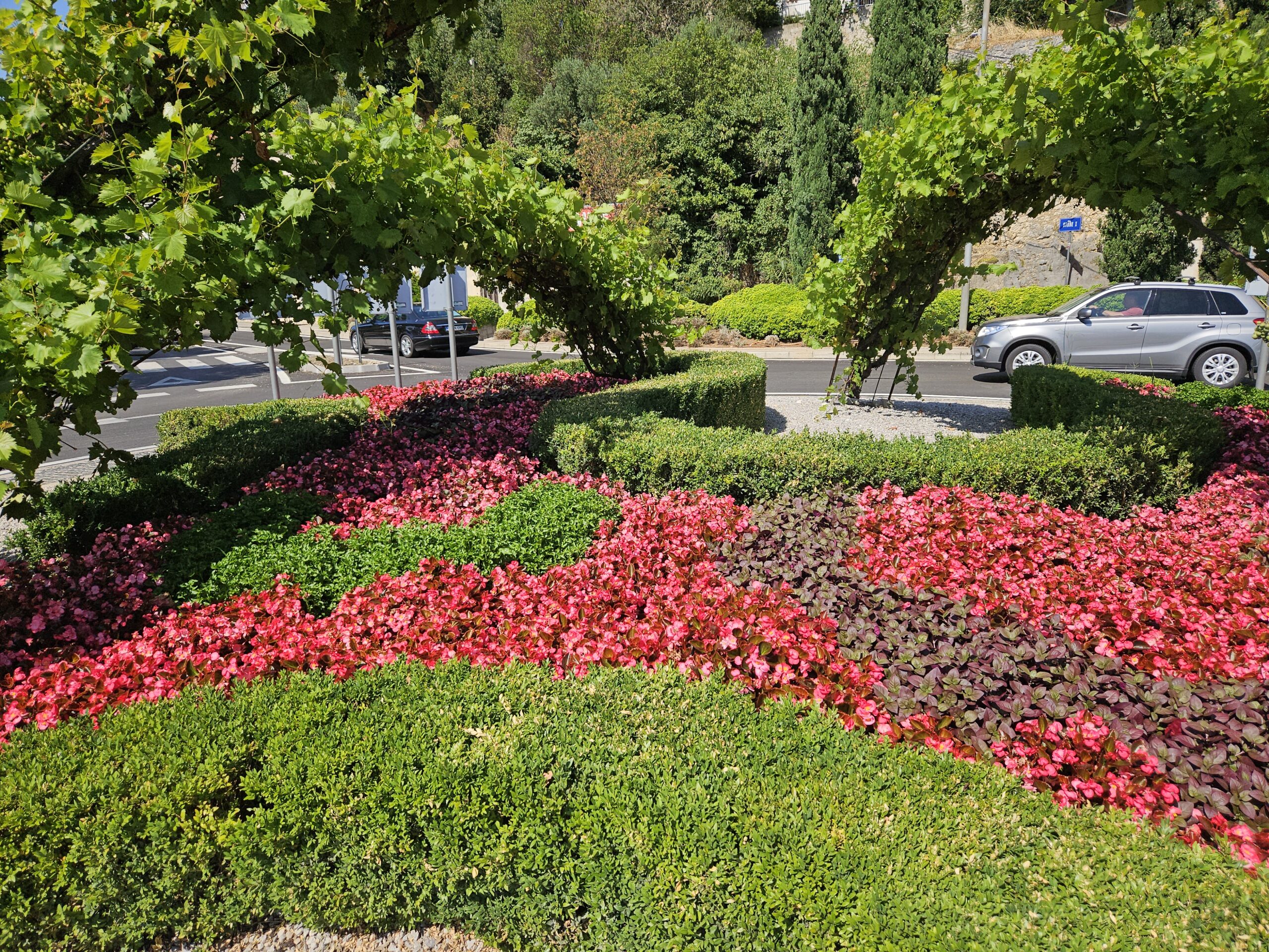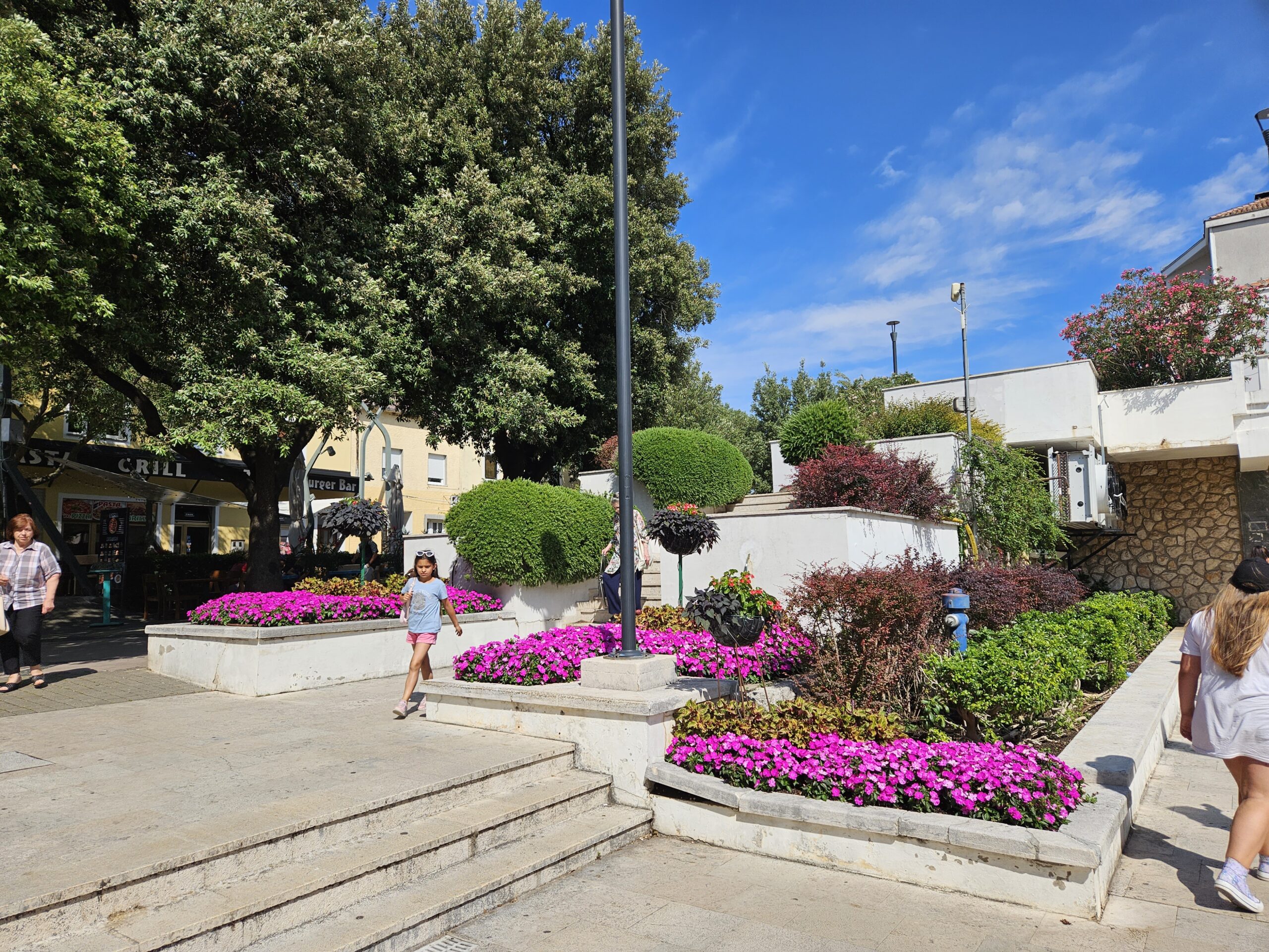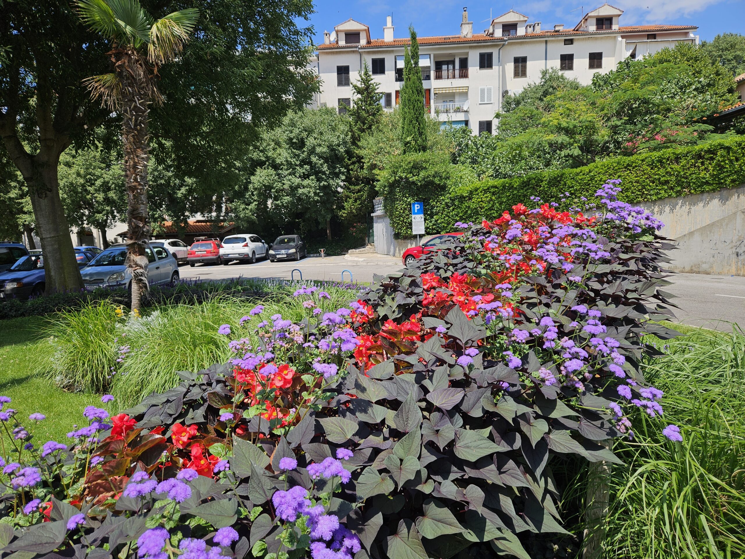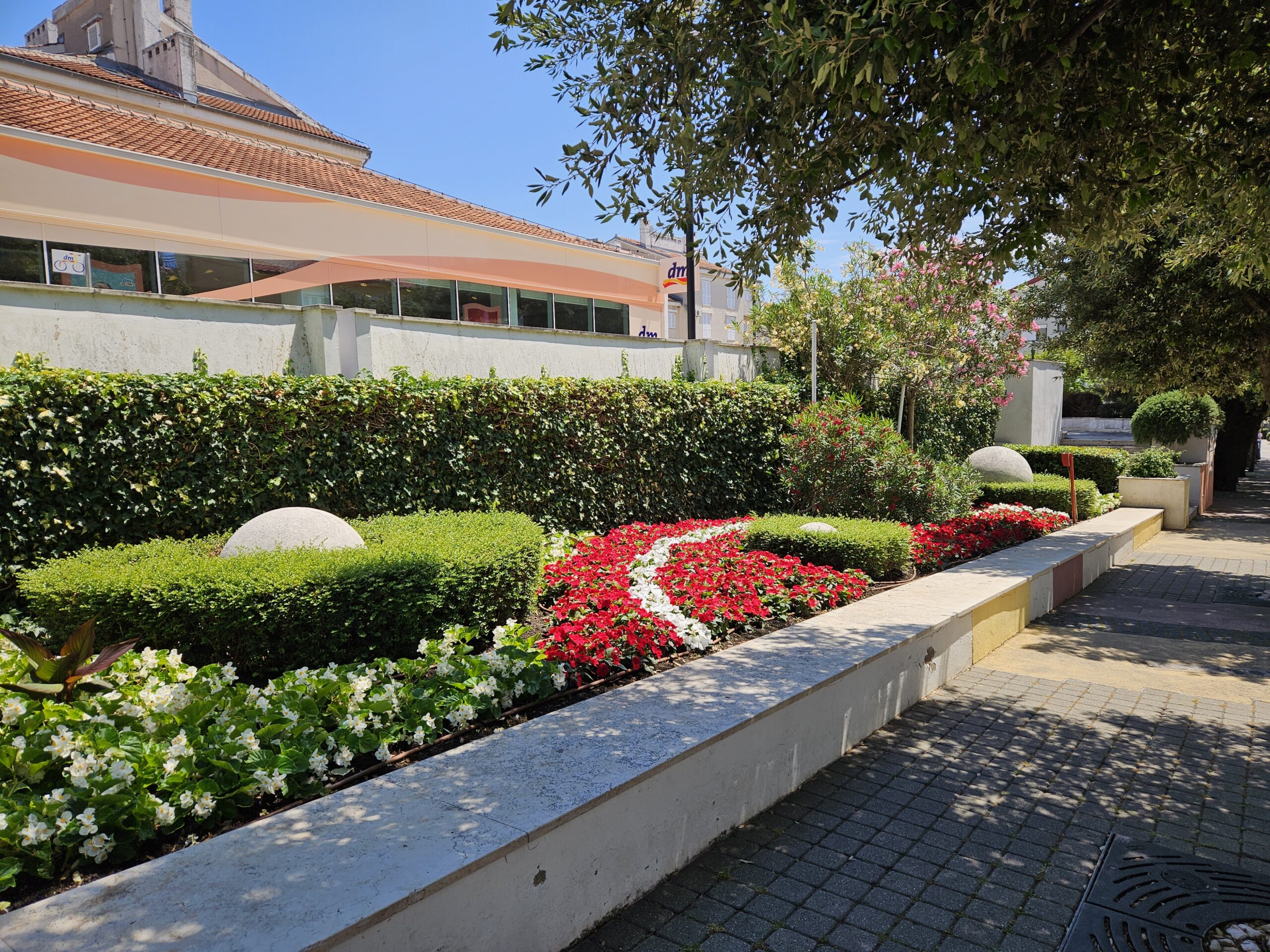 Cvjetne  gredice u ljeto 2023. obojane su raznim bojama; crveno, rozo, plavo. Crvene kane podižu pogled od horizontalih cvijetnih oblika, prema rascvjetnim oleanderima, indijskim jorgovanima i visokim palmama.