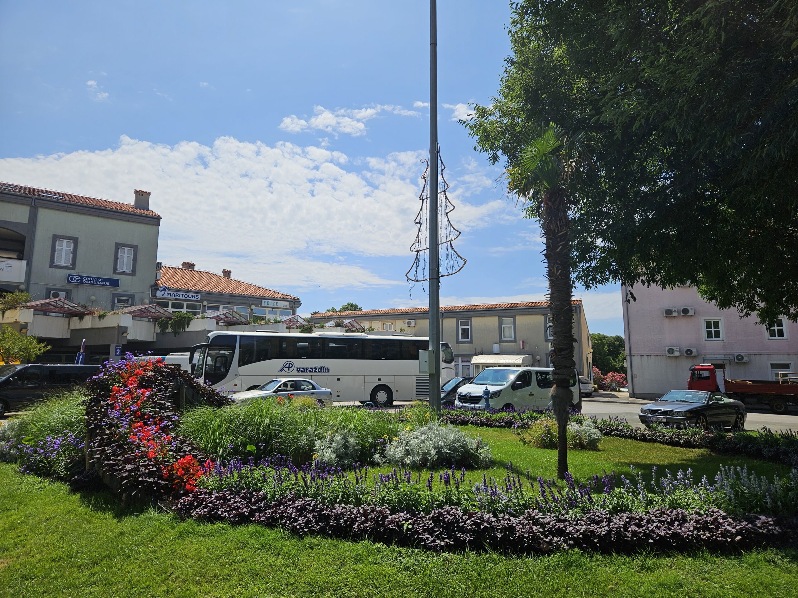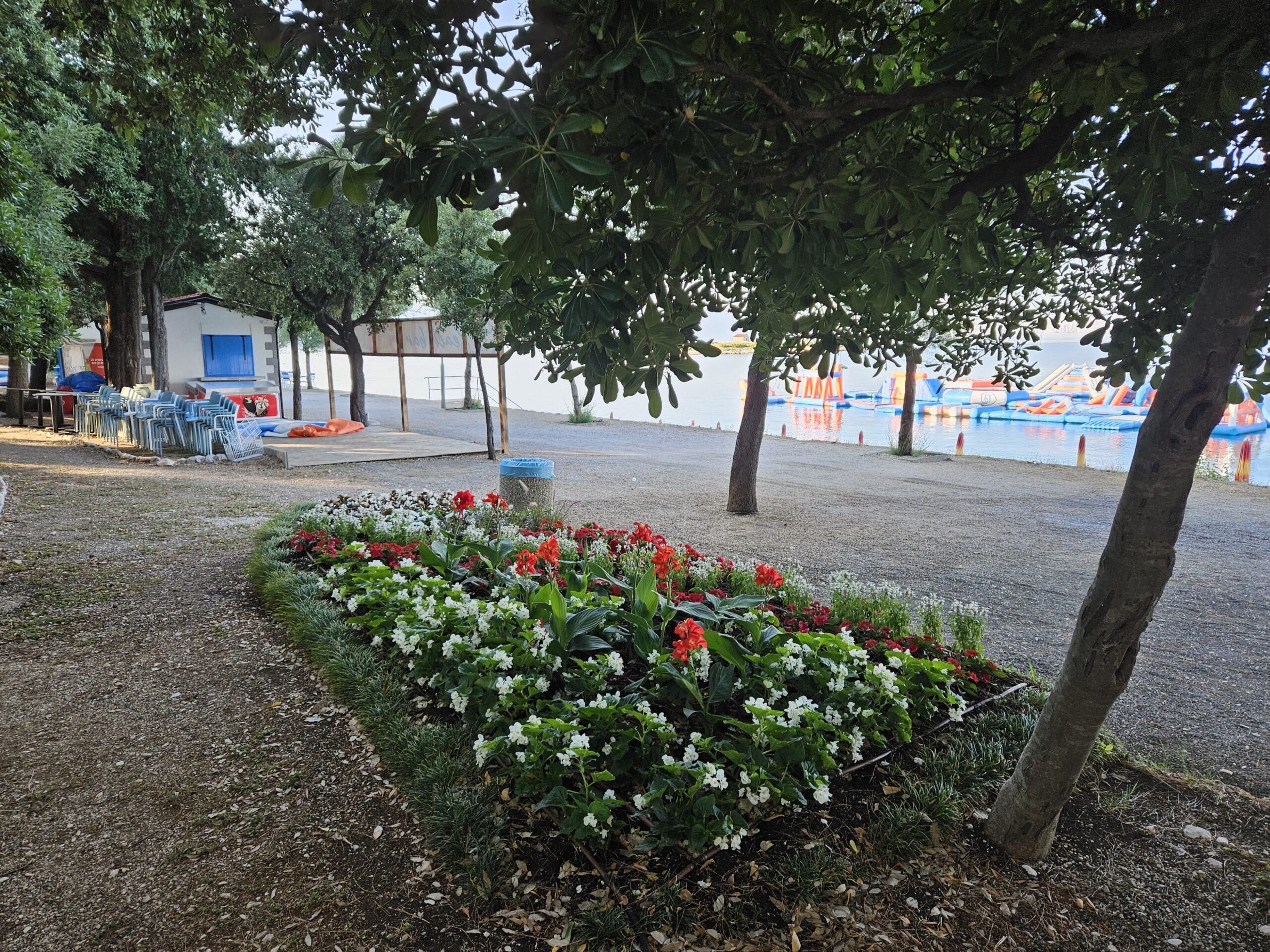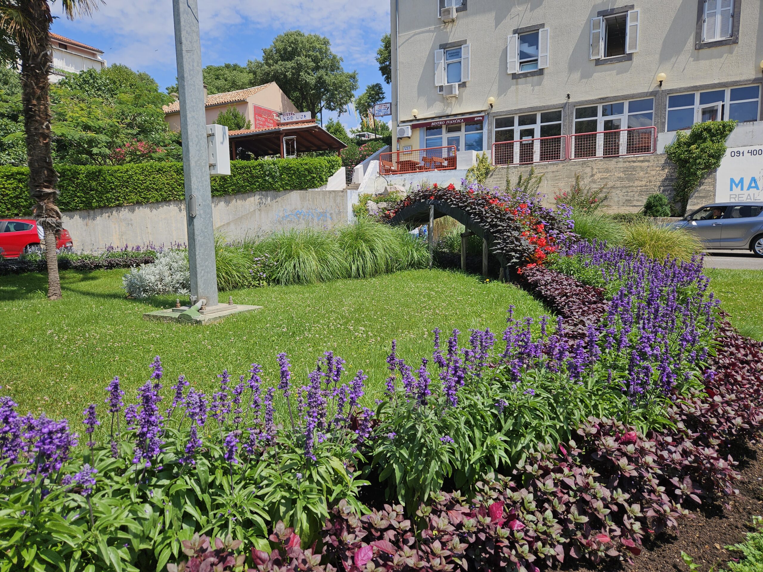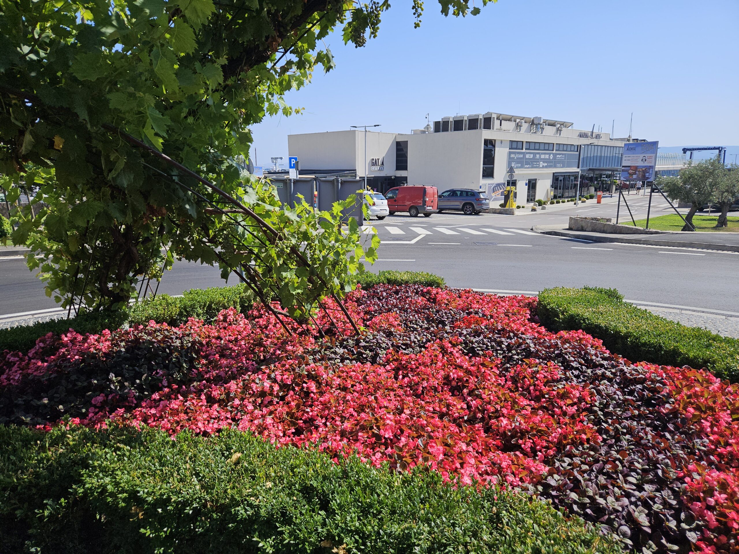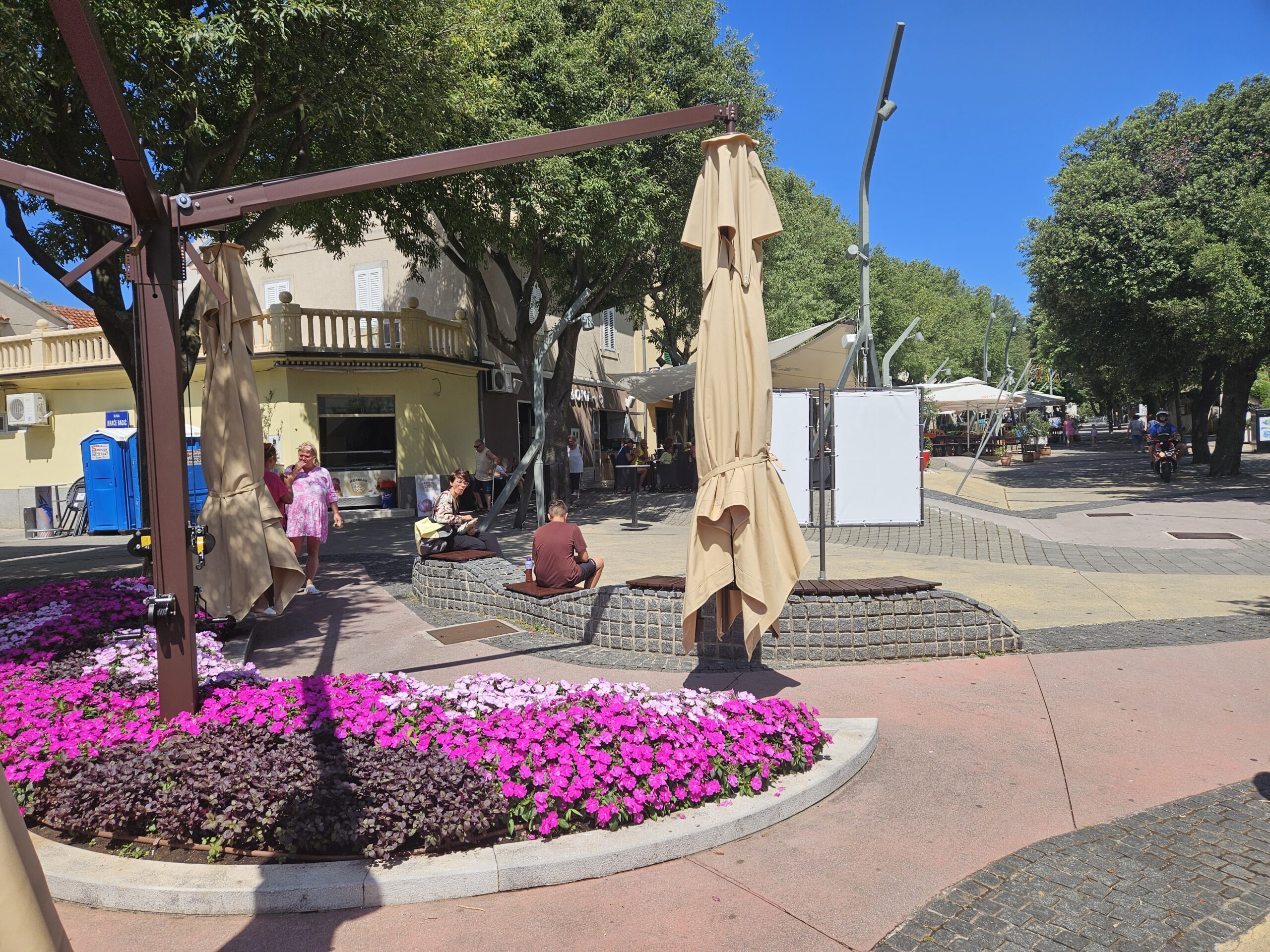 Cvjetne  gredice u ljeto 2023. obojane su raznim bojama; crveno, rozo, plavo. Crvene kane podižu pogled od horizontalih cvijetnih oblika, prema rascvjetnim oleanderima, indijskim jorgovanima i visokim palmama.