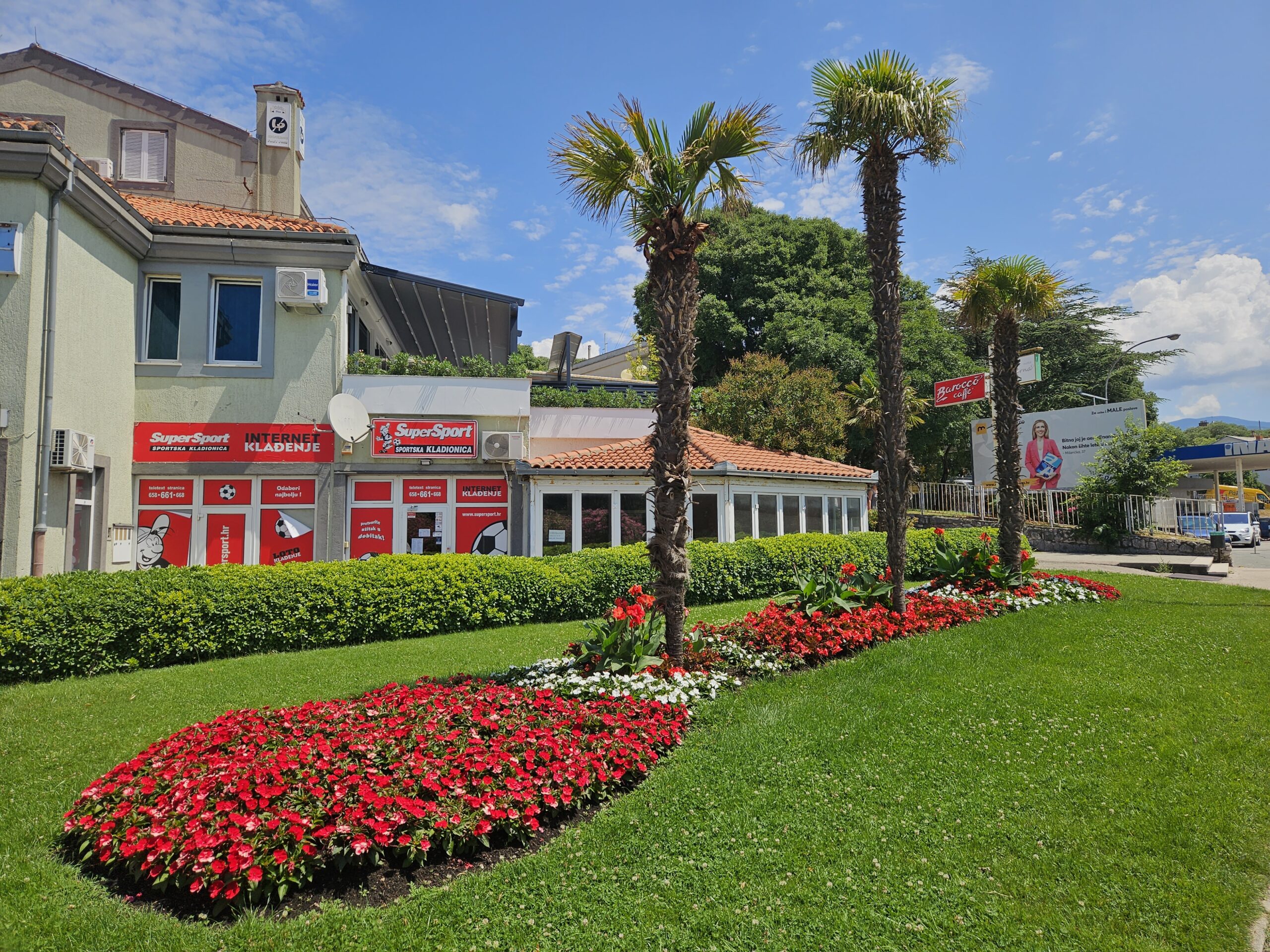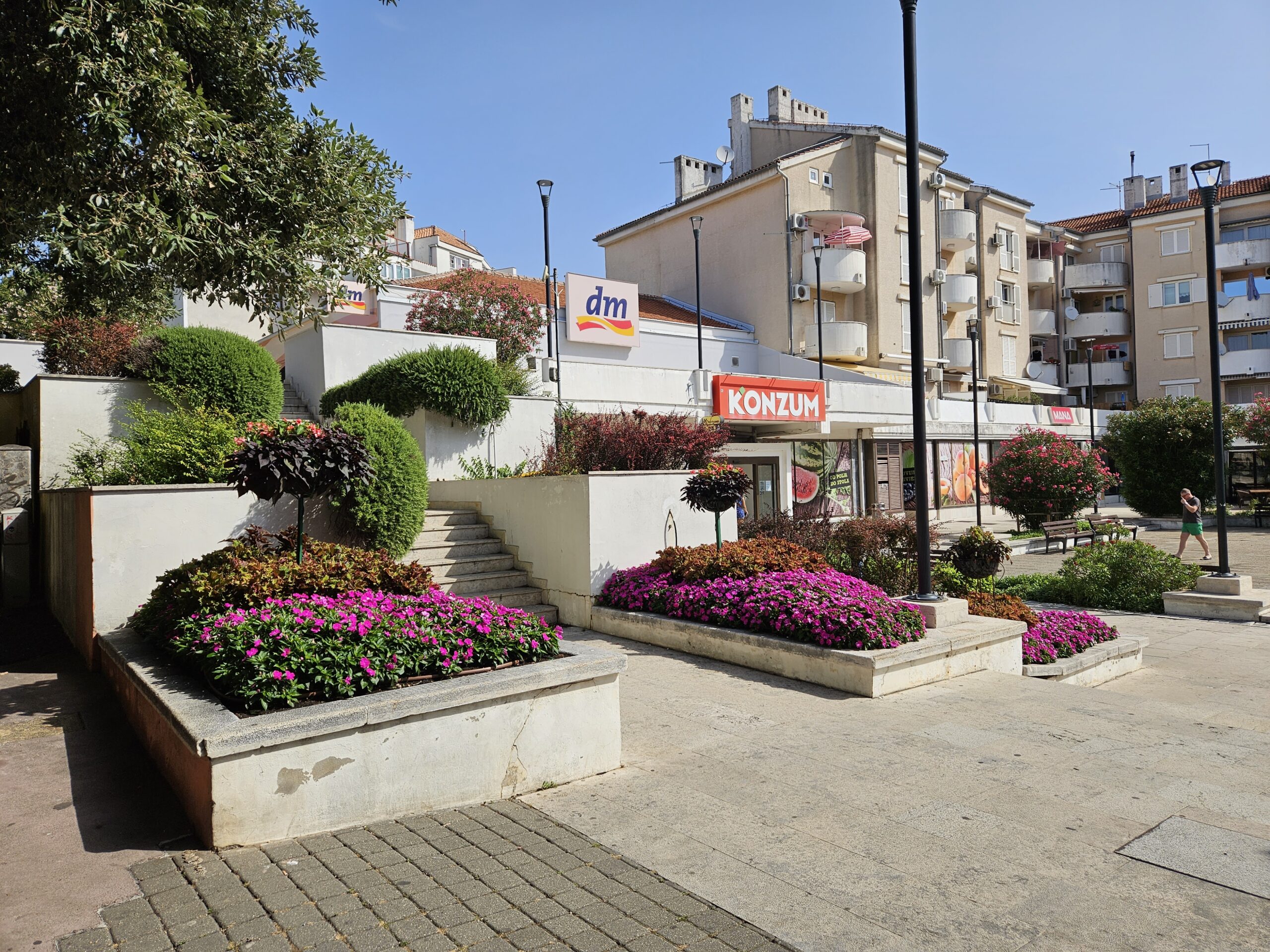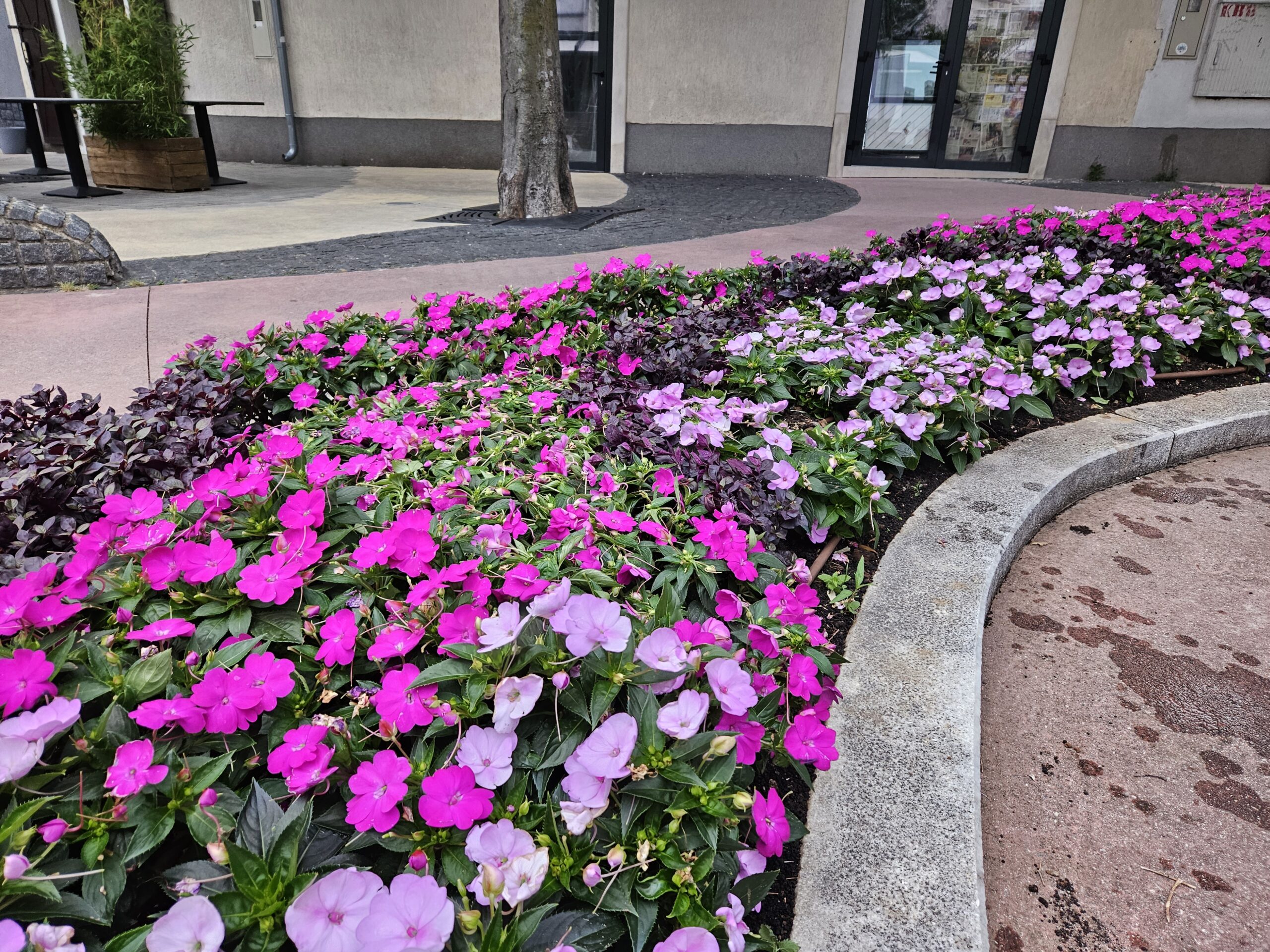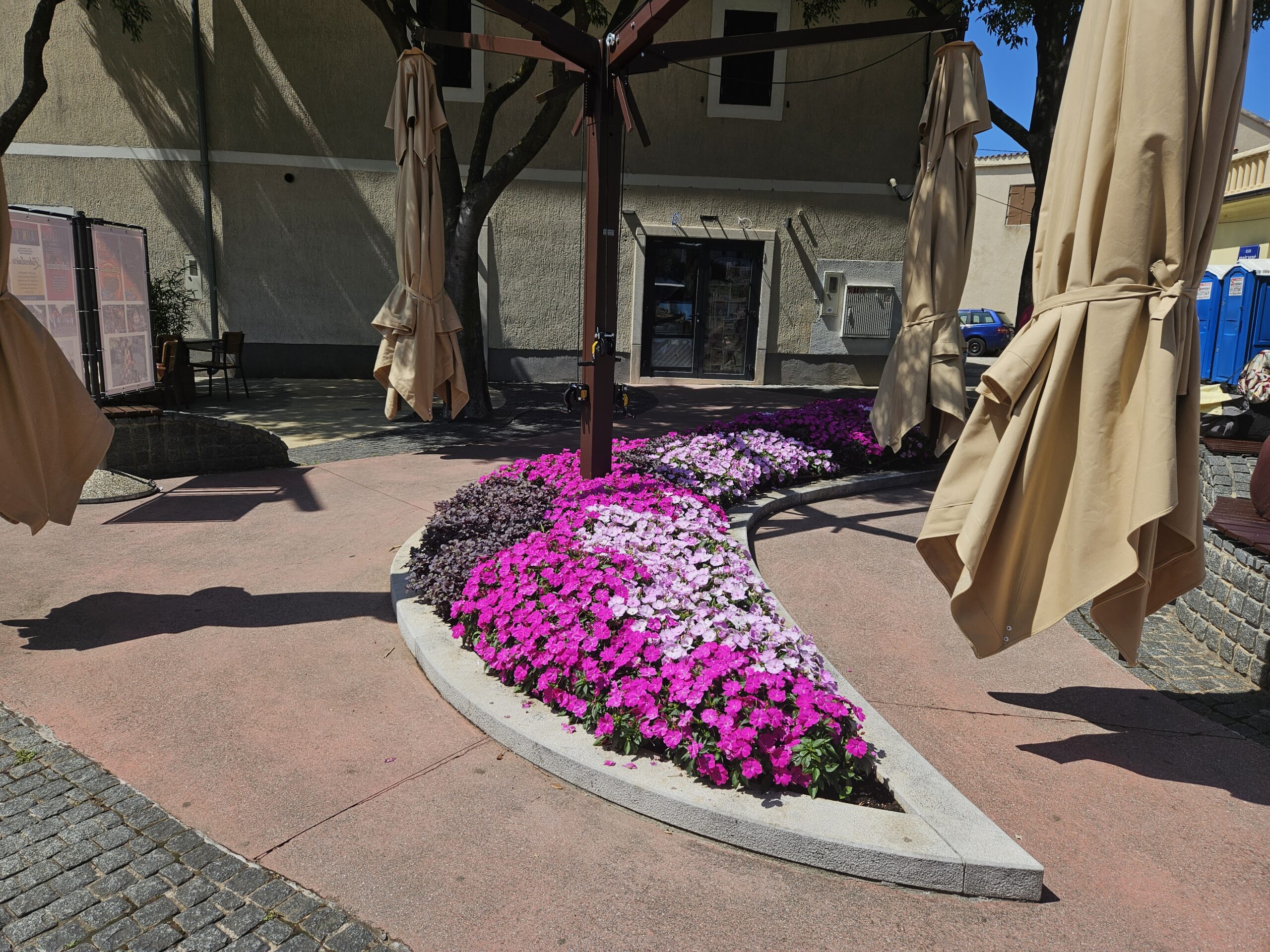 Cvjetne  gredice u ljeto 2023. obojane su raznim bojama; crveno, rozo, plavo. Crvene kane podižu pogled od horizontalih cvijetnih oblika, prema rascvjetnim oleanderima, indijskim jorgovanima i visokim palmama.