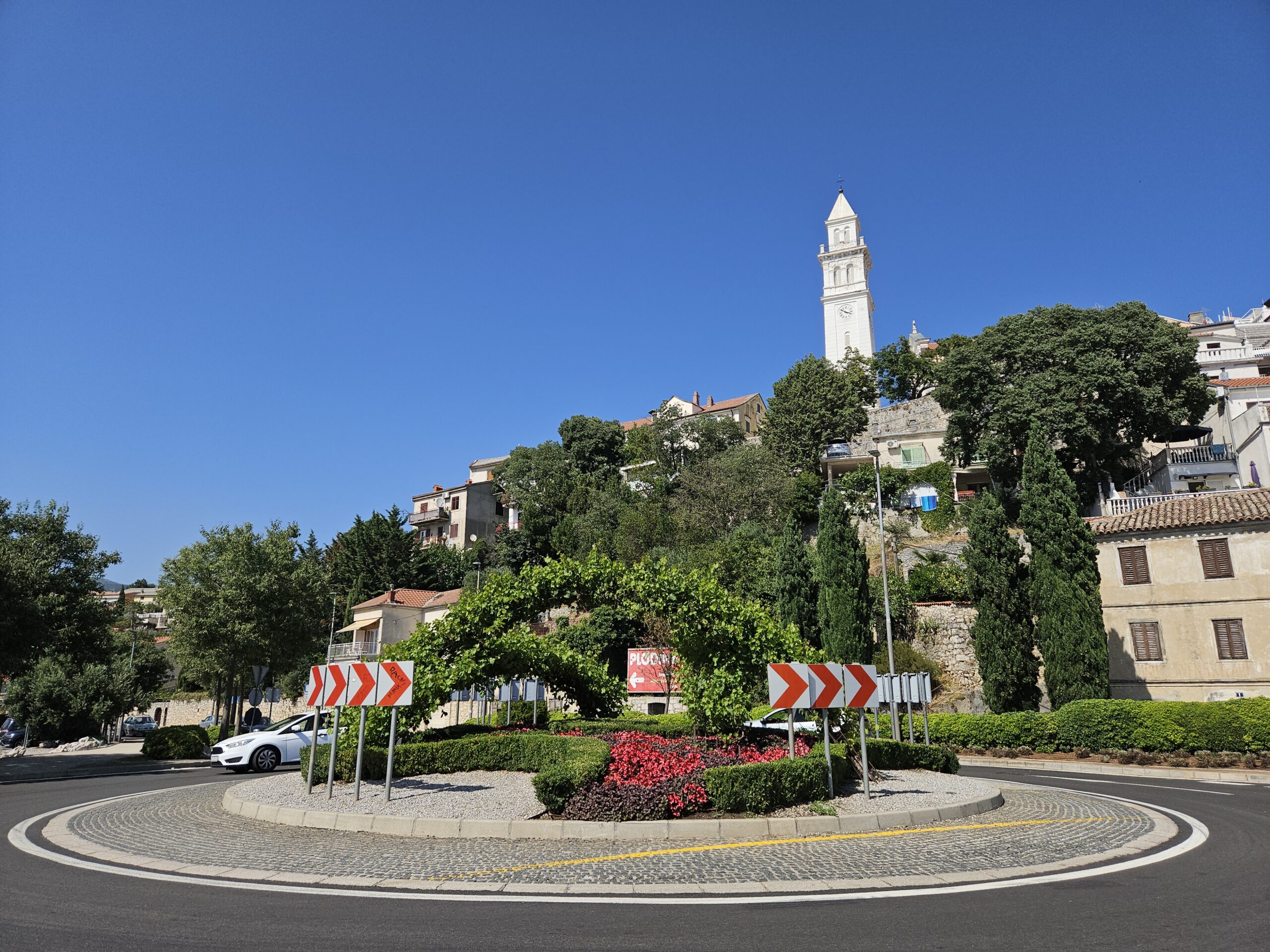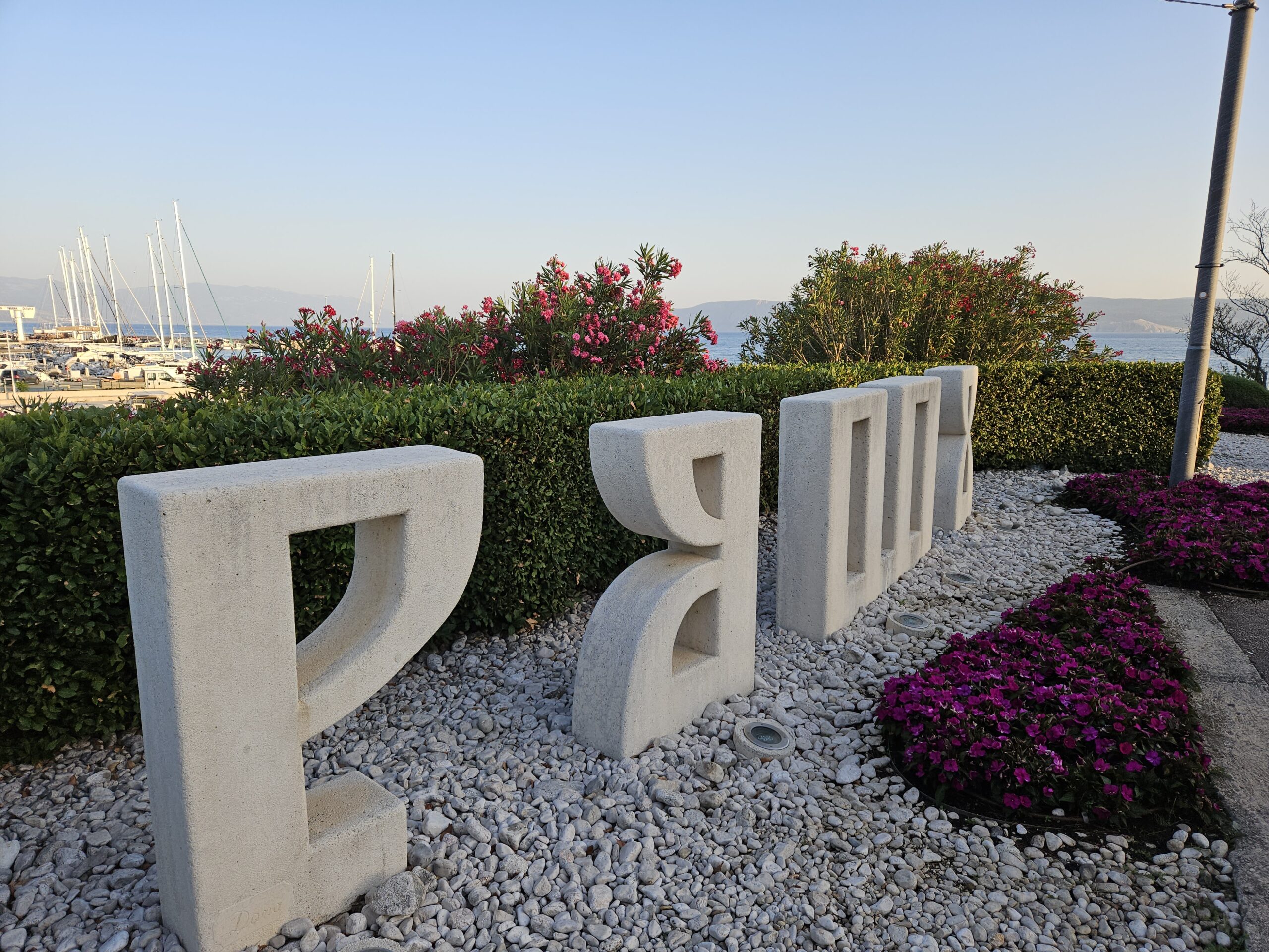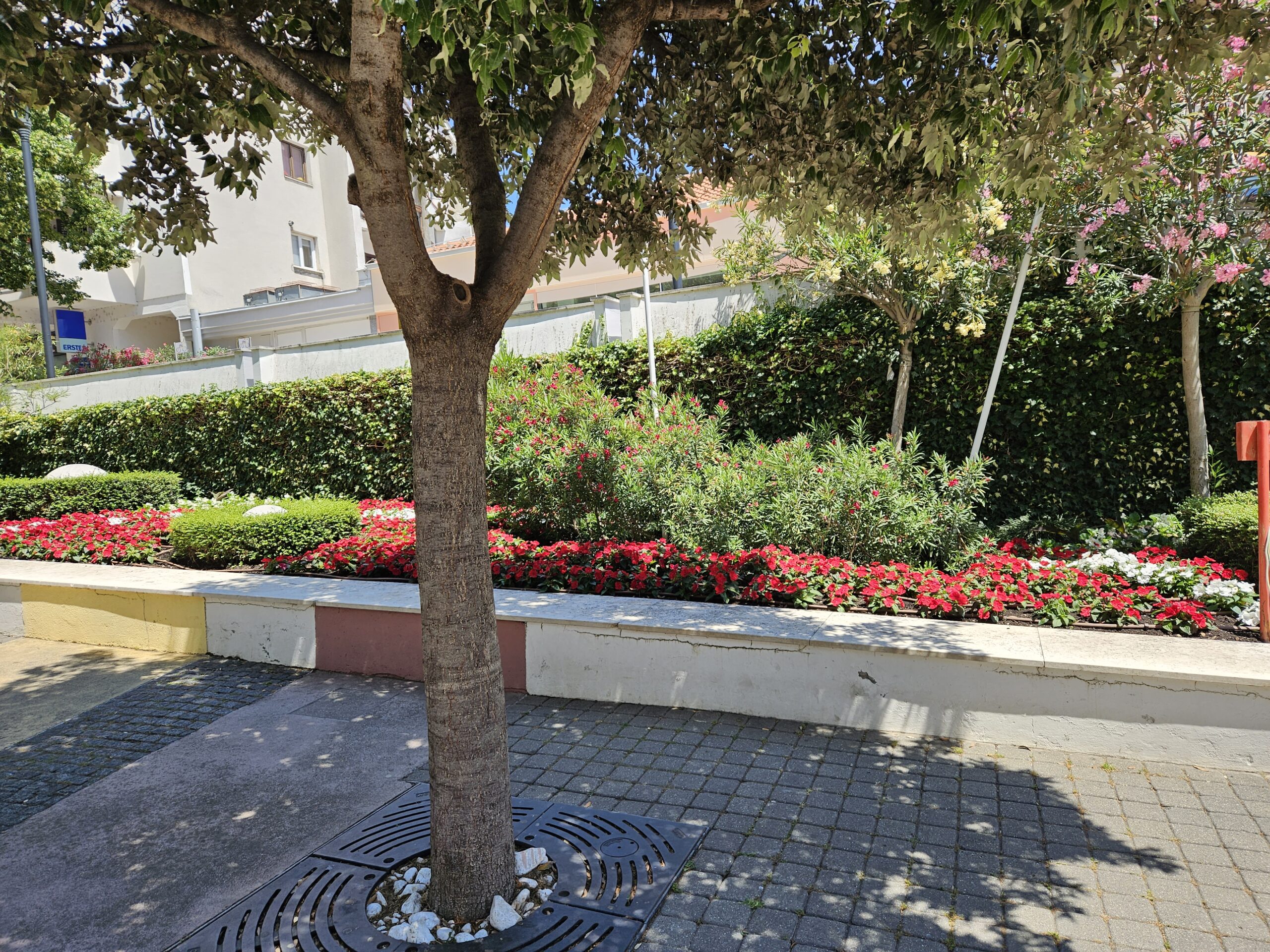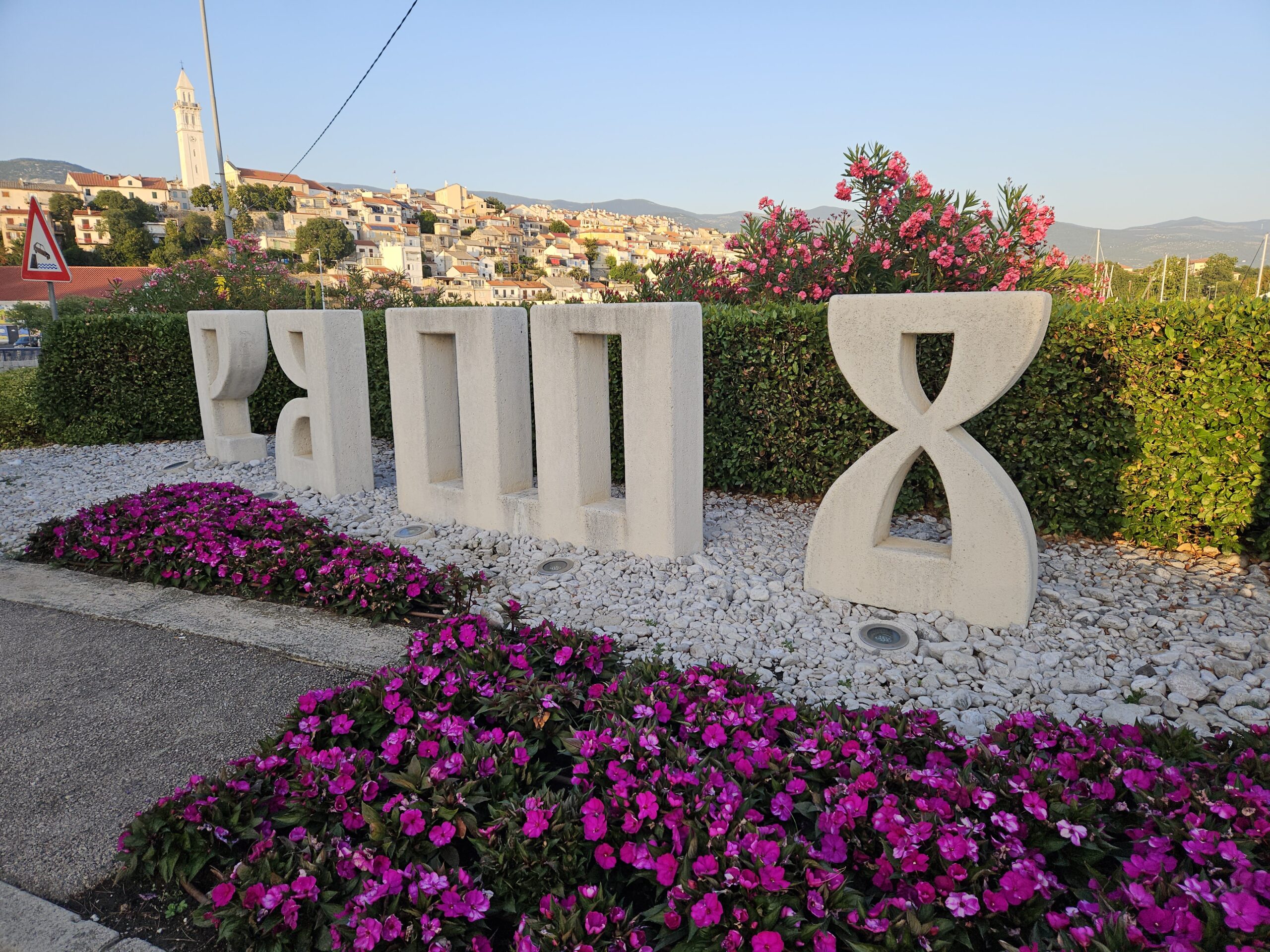Cvjetne  gredice u ljeto 2023. obojane su raznim bojama; crveno, rozo, plavo. Crvene kane podižu pogled od horizontalih cvijetnih oblika, prema rascvjetnim oleanderima, indijskim jorgovanima i visokim palmama.