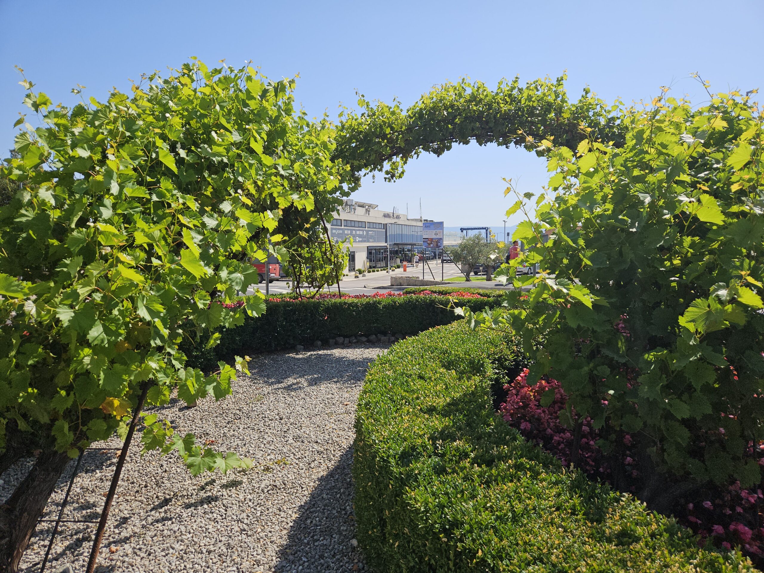 Zeleni travnjaci i zelene živice čine smireni paspartu cvijetnim plohama i ističu boje cvjetova. Na kružnom toku niske cvijetne forme ističu lukove koje prekriva vinova loza.