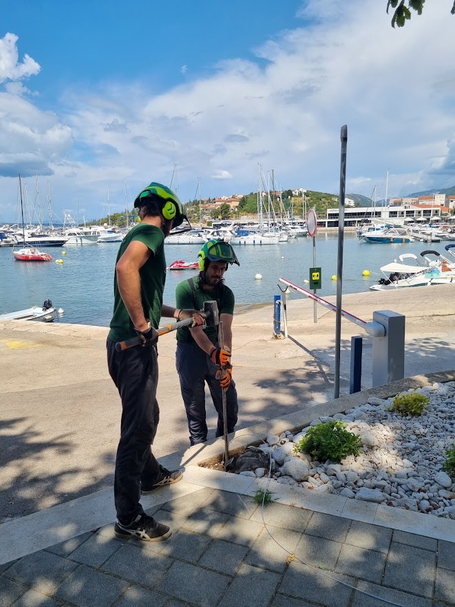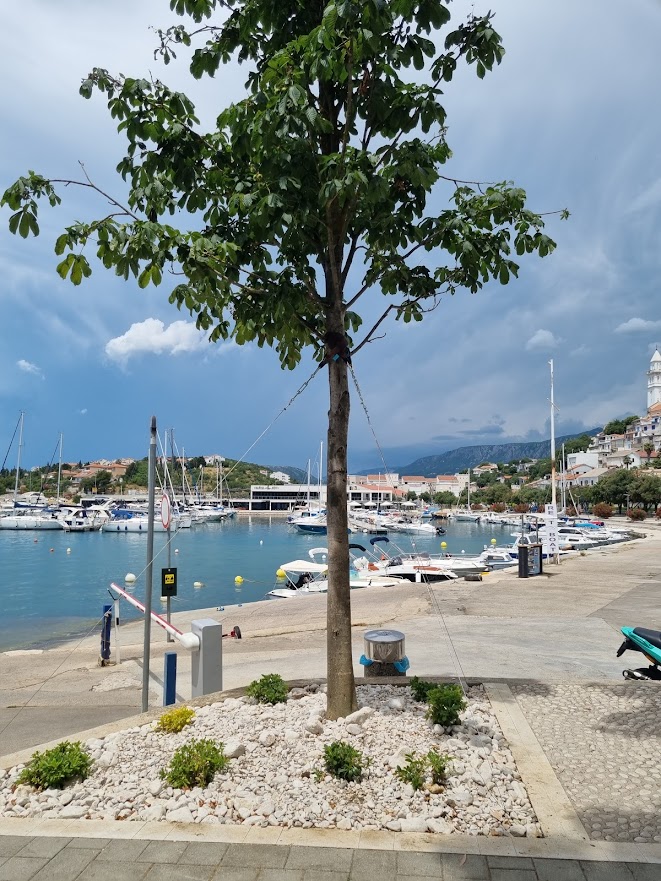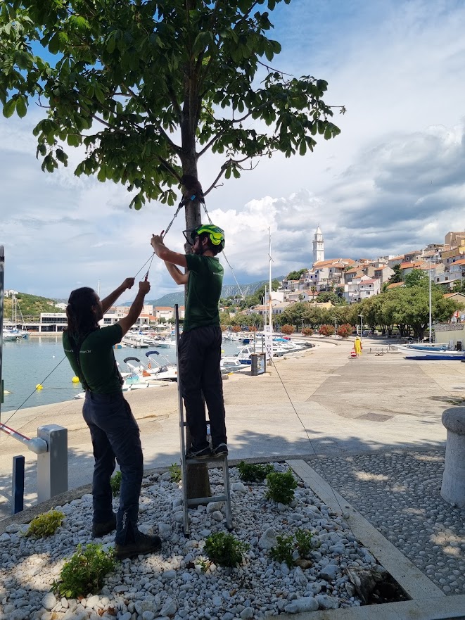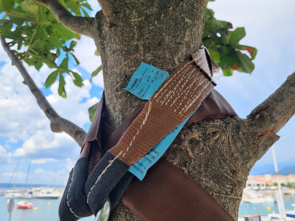Stabla divljeg kestena, posađena u proljeće, usidrena su sa dva kompleta za nadzemno sidrenje proizvođača GEFA fabritz s dinamičkim užetom za sadnice opsega do 90 cm.