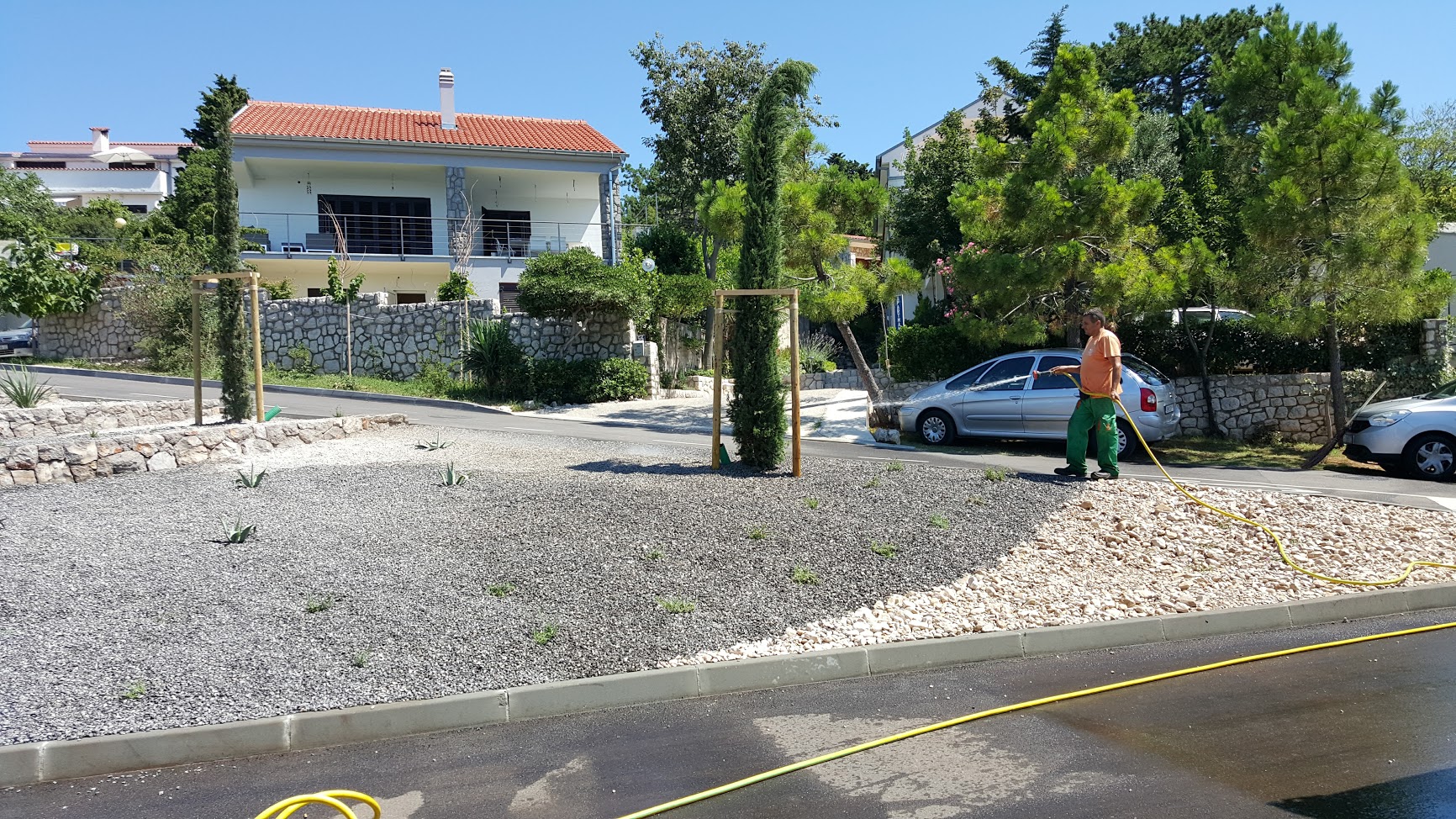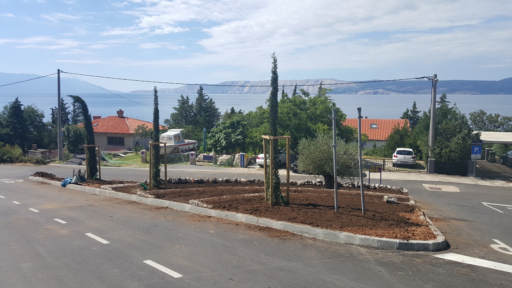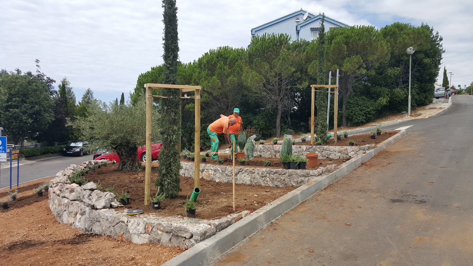 Na sjecištu ulica Pod Sv. Mikulj i Riječke ulice uređen je trokut između prometnica. Kaskadno formirana ploha s kamenim zidićima presječena je polukružnim potezom lavandi. Središnju ulogu i poziciju ima stoljetna maslina, kojoj po formi i boji kontriraju visoki uski čempresi. Juke i agave su strukturne biljke koje također stvaraju jedinstvene oblikovne forme, te se svaka svojom nijansom zelene boje jako lijepo ističu na podlozi od sivog kamenog drobljenca i bijelih kamenih oblutaka. U okolnim vrtovima se pojavljuju također masline i čempresi, tako da je novo uređena površina uklopljena u okolni prostor.