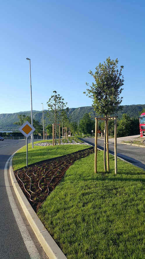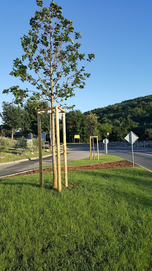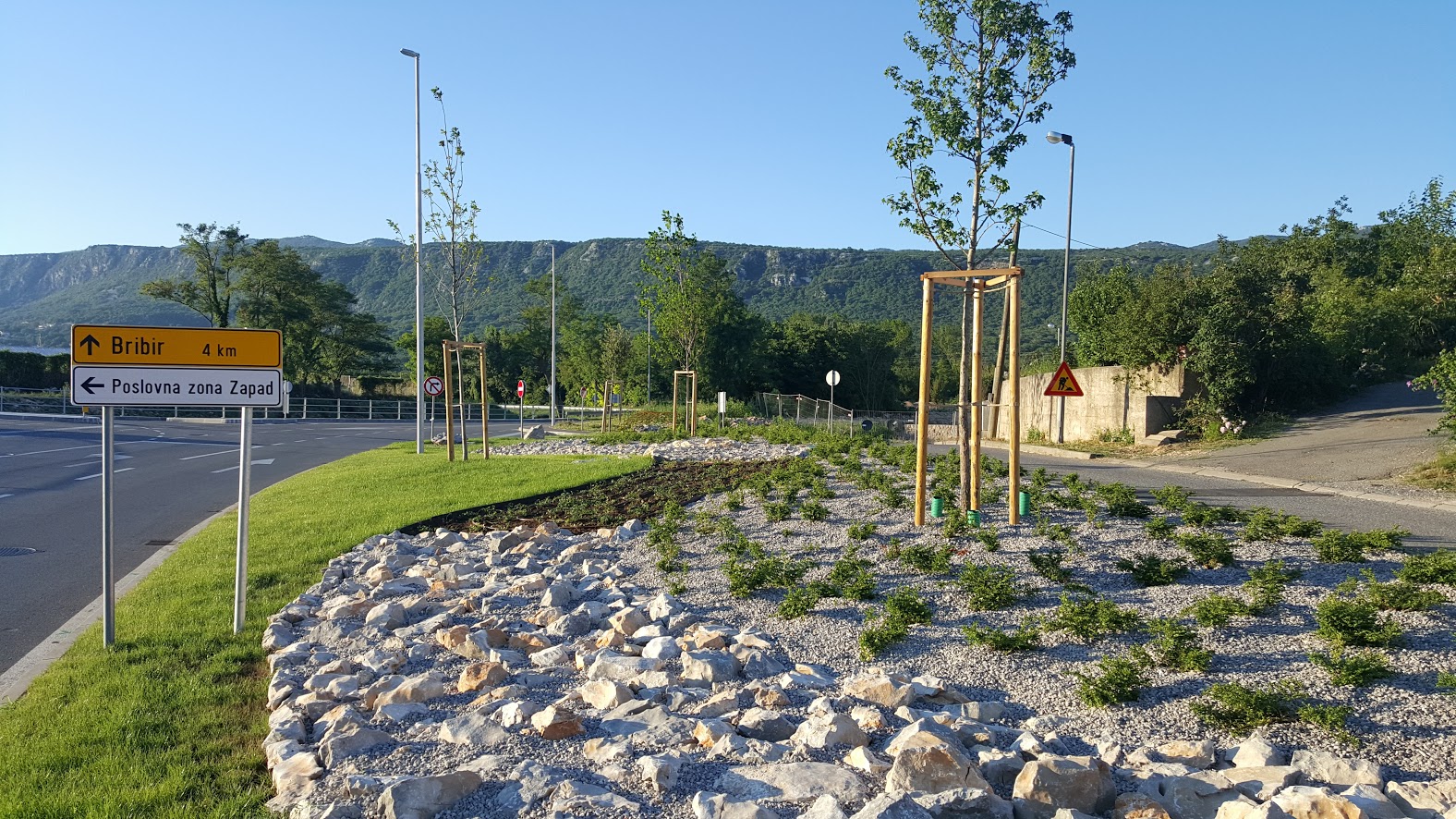 Na cesti prema Bribiru, a na ulazu u naselje Mikulja i Industrijsku zonu, u proljeće 2017. uređena je nova zelena površina. Centralnim dijelom površine prolazi vijugavi suhi kameni potok, koji je na tri dijela ispunjen trajnicama čiji cvijet je plave boje: Vinca minor ‘Bowles Variety” – mali zimzelen, Ceratostigma plumbaginoides – plavuljak, Campnula portenschlagiana – zidna zvončika ; koje predstavljaju vodu u svom periodu cvatnje. Gornji dio površine je prekriven niskim zimzelenim grmovima kozokrvine (Lonicera pileata), koja će se šišati plošno. Prednji dio je veliki travnjak s jednim kamenim otokom. Na cijeloj površini zasađene su prekrasne velike stablašice, a one na travnjaku posađene su na male brežuljke, koji predstavljanju okolno brežuljkasto područje. Listovi stabla su tijekom proljeća i ljeta zelene boje, a u jesen listopadni dio stabala mijenja bolje, dio u žarko crvenu, dio u prekrasnu žutu.