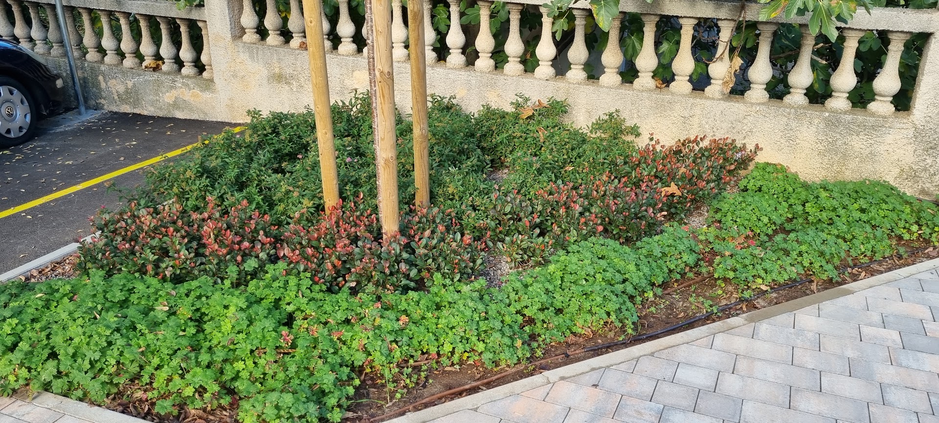 Mala zelena površina kod pješačkog prijelaza u blizini škole zasađena je sa skupinom grmova i trajnica: